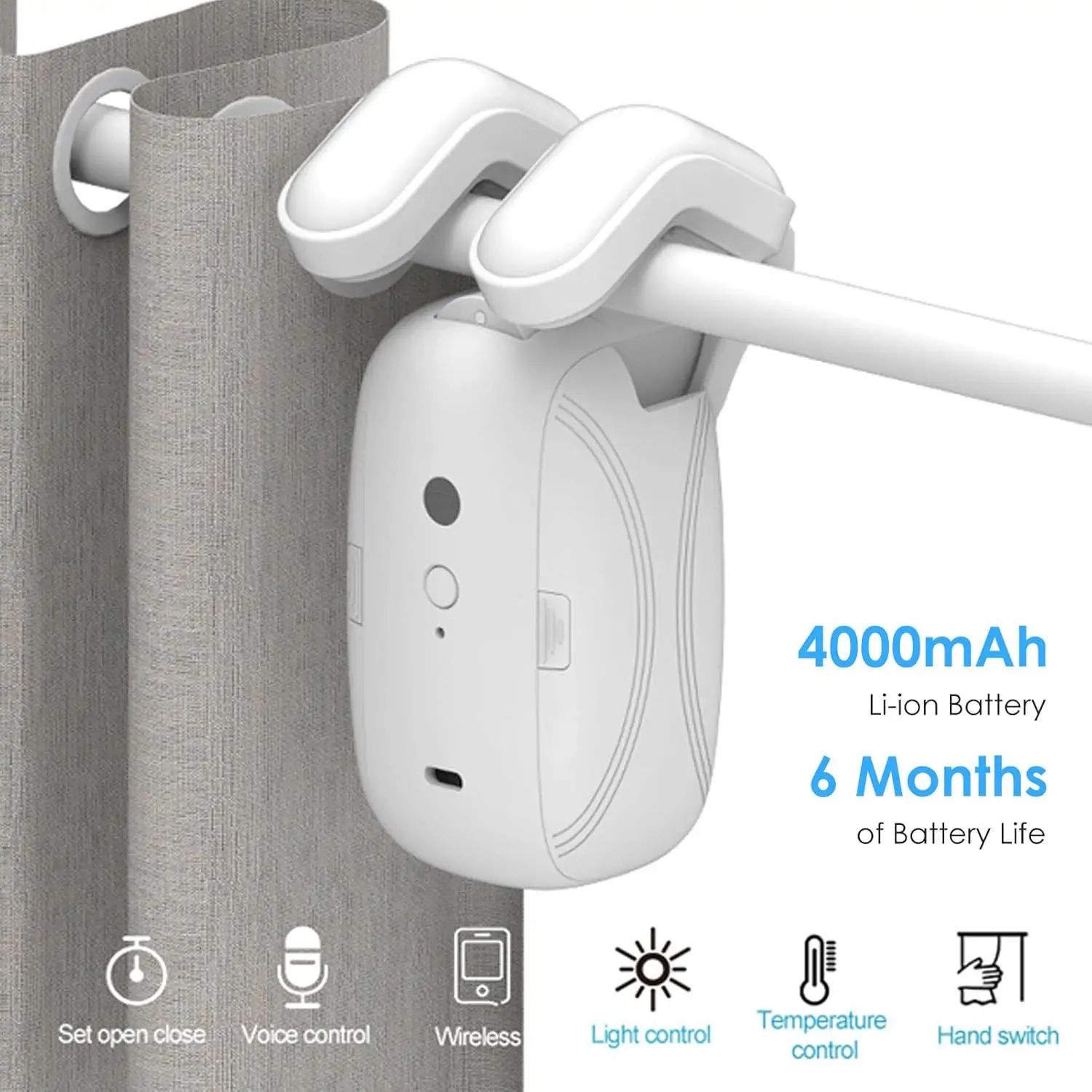 عيشِ رفاهية تحكم الستائر الذكي في أي وقت — مع محرك ستائر ذكي مزود بتحكم صوتي وتطبيق TUYA، ومزود بمستشعر ضوء أوتوماتيكي ليتصرف بنفسه. التشغيل الهادئ (< 25 ديسيبل) يجعل الجهاز مثالي لغرف النوم، بينما البطارية القوية (4000 مللي أمبير) تضمن عملًا متواصلًا لعدة أشهر بدون شحن متكرر.