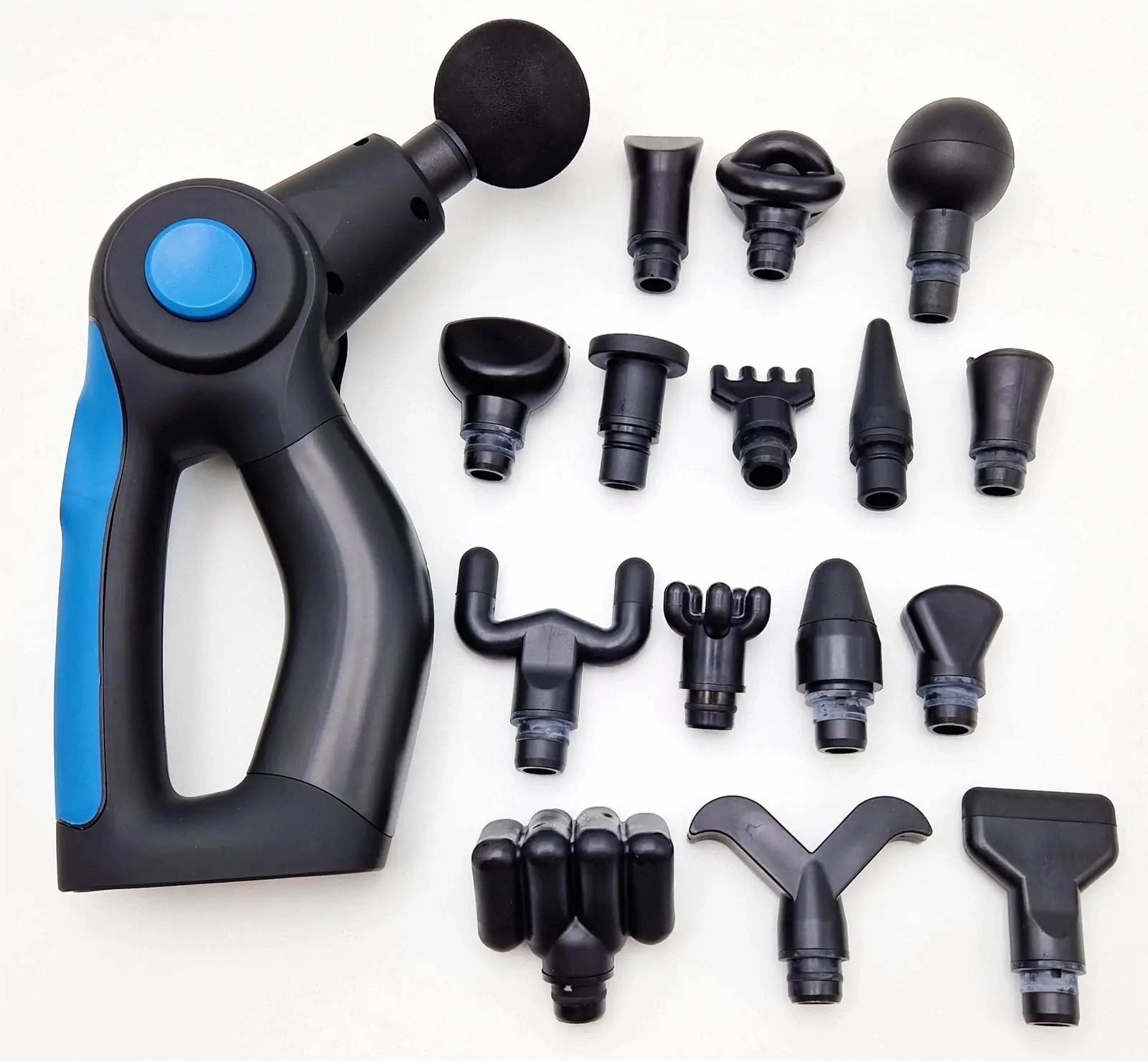 ● محتويات العلبة: جهاز CHIROGUN للتدليك، محوّل/شاحن، قاعدة شحن، حقيبة تخزين، كيس للرؤوس، مجموعة رؤوس متعددة
